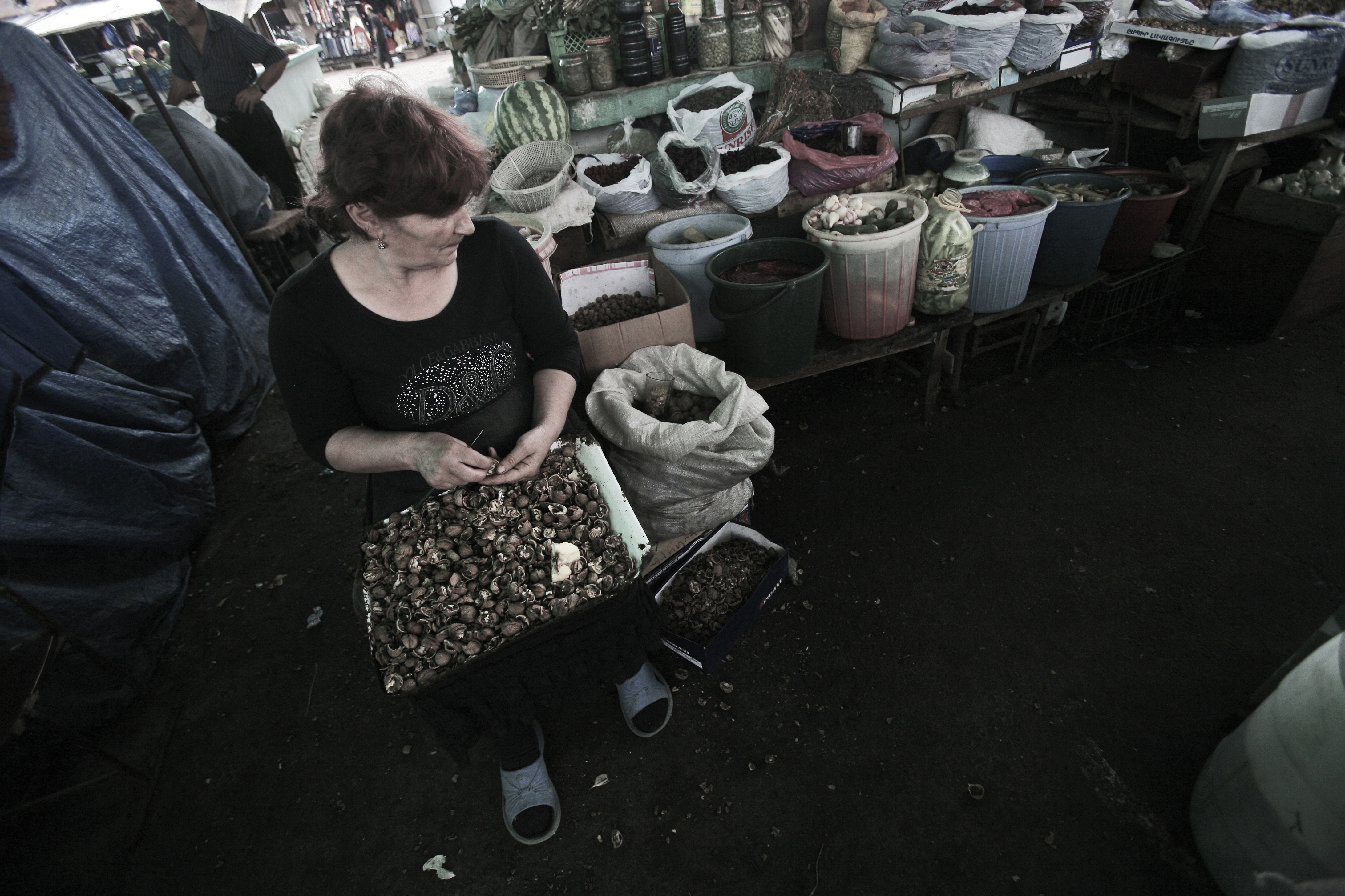 A saleswoman cracks nuts in a food market in Stepanakert. With a population of 140.000, the majority being Armenians, Nagorno Karabakh Republic aims to achieve political and economical stability. The high unemployment rate, low salaries and the lack of opportunities for the youngsters make the unrecognized republic to be a hard place to live. Stepanakert, Nagorno-Karabakh, 20 September 2008.