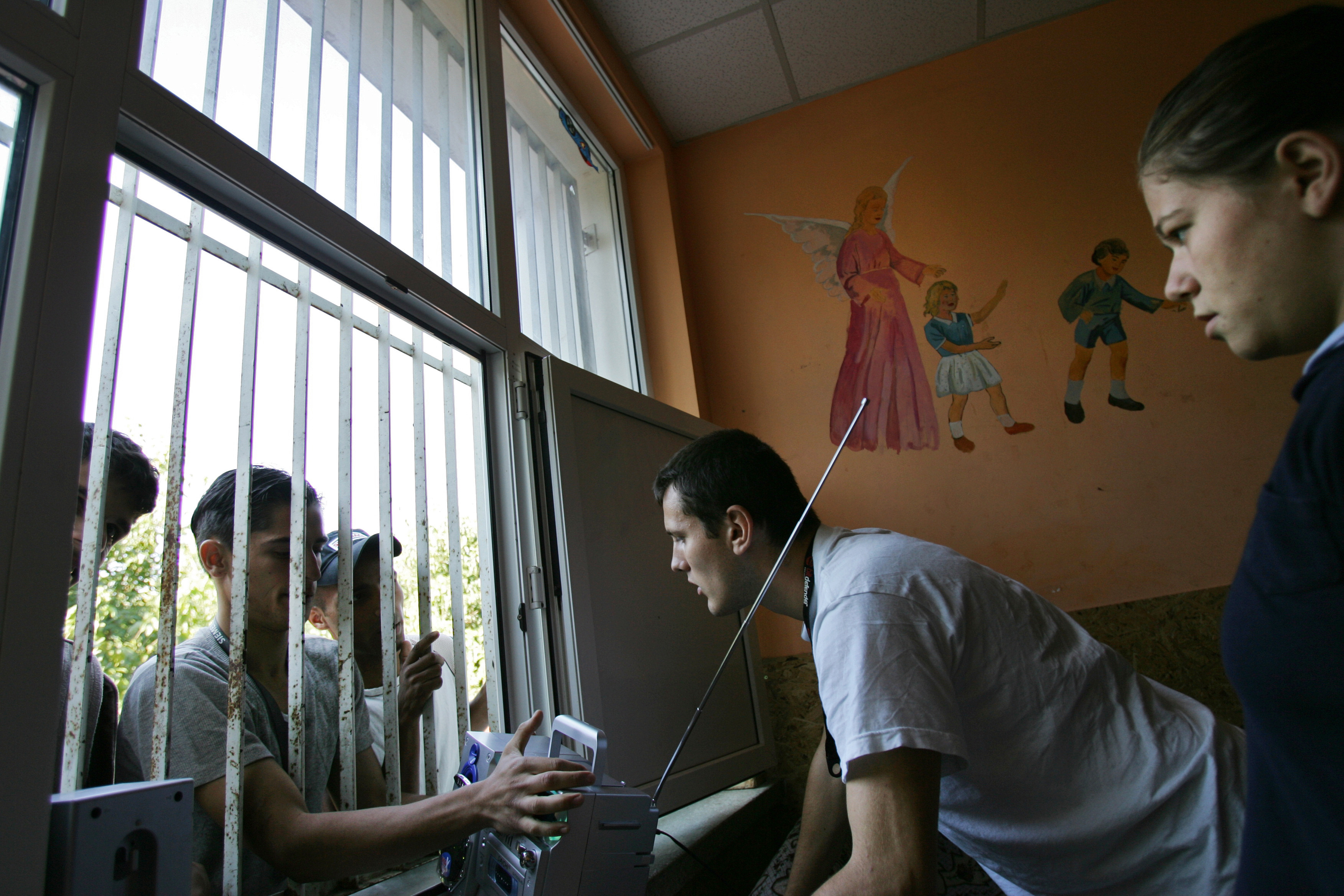 Teenagers talk on Saint Lazarus Orphanage, a transit center for children who lives on the street. On the orphanage street children can find hot meal, warm bad and water. Baneasa village, Bucharest, Romania, 4.09.2005.