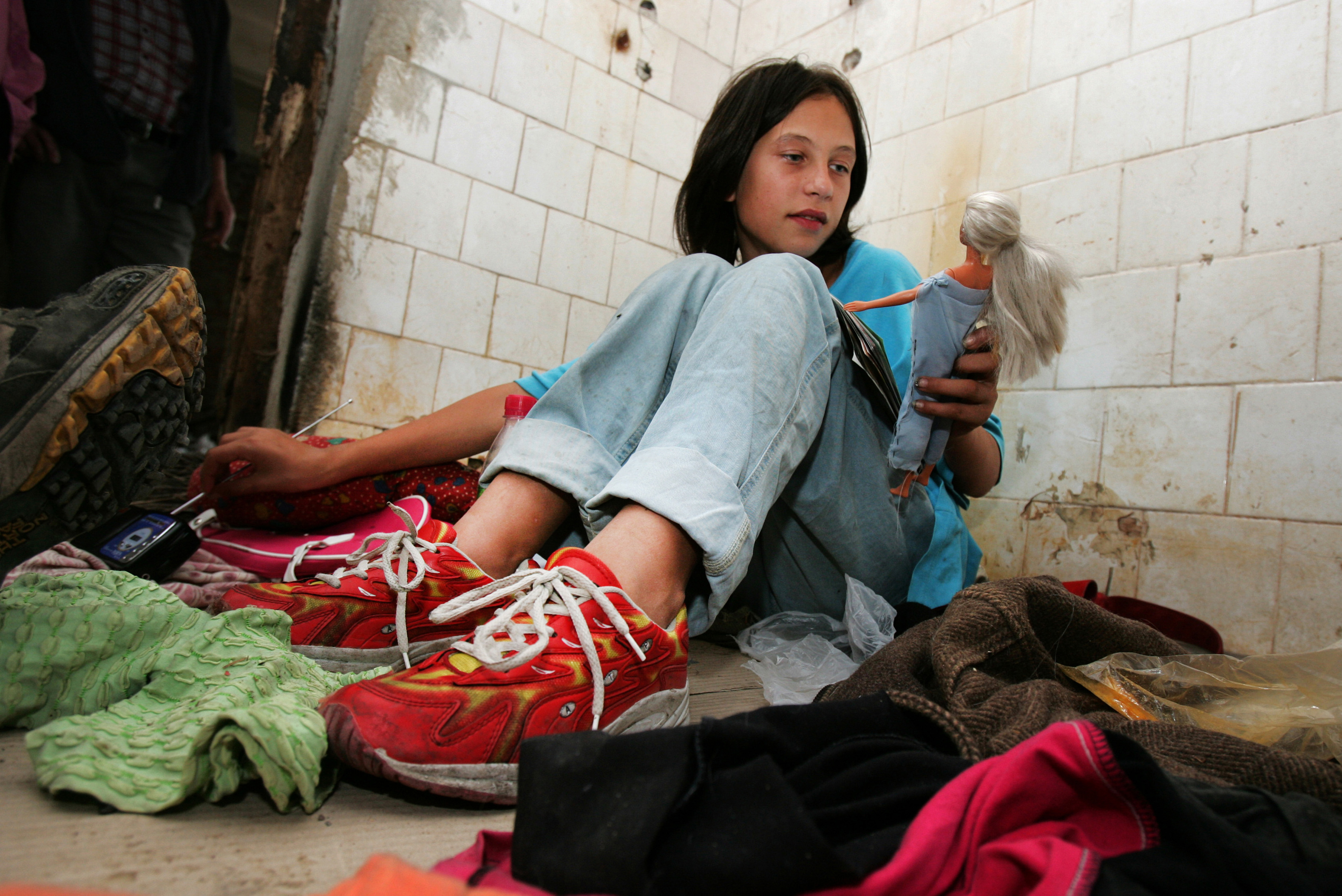 Ionela Pop plays with a doll inside an abandoned building situated near "Gara de Nord" railway station in Bucharest. Ionela is a 13 years old homeless girl and prostitute. Bucharest, Romania 4.09.2005.