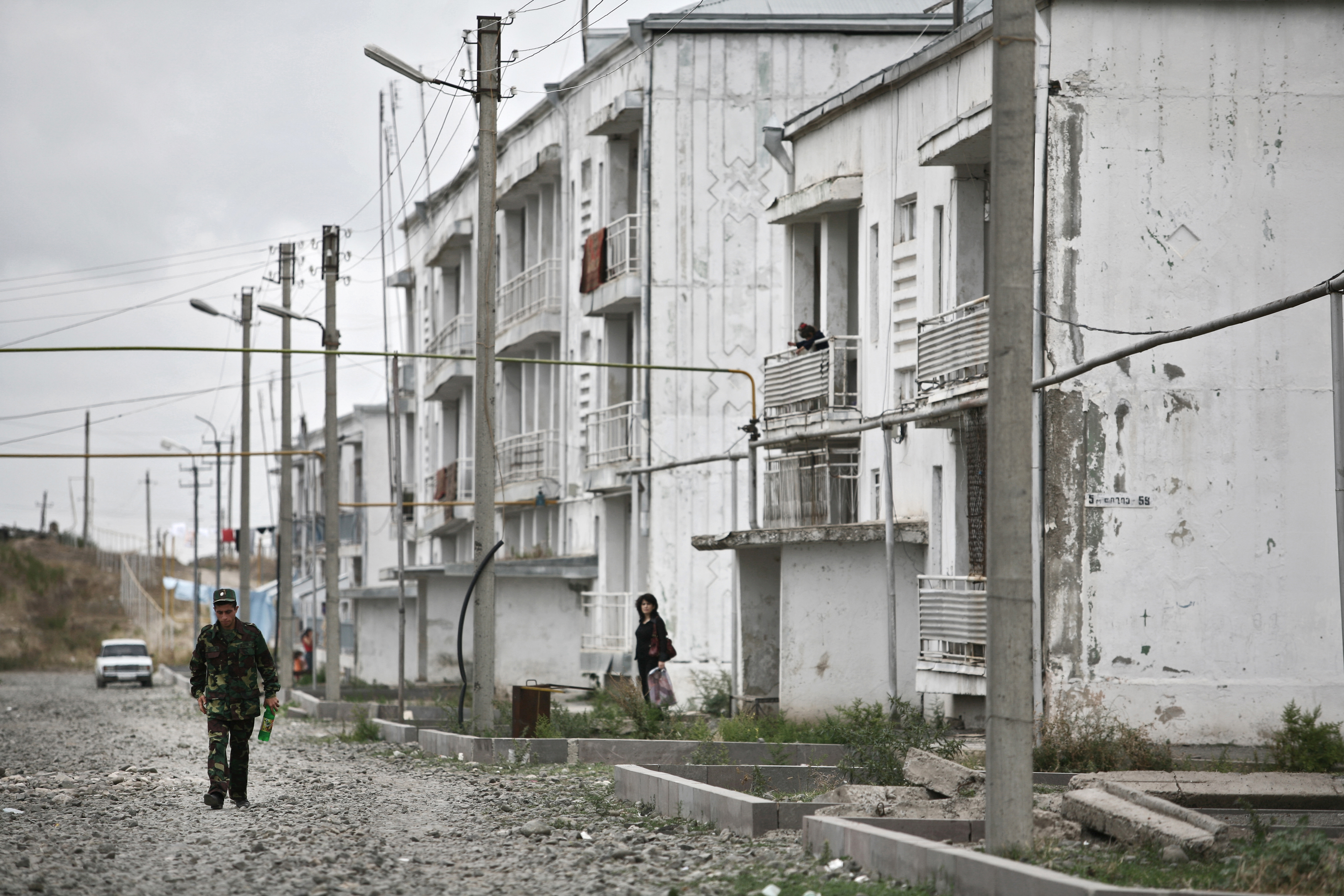 A soldier walks on a street in Khojaly city, Nagorno-Karabakh. The city is a military base, situated near the border with Azerbaijan and 10 km Northeast of the capital Stepanakert. The city is known for the Khojaly Massacre committed on 25–26 February 1992 by the Armenian and, partially, by CIS armed forces (the Russian 366th Motor Rifle Regiment) during the Nagorno-Karabakh War. Khojaly, Nagorno-Karabakh, 19 September 2008.