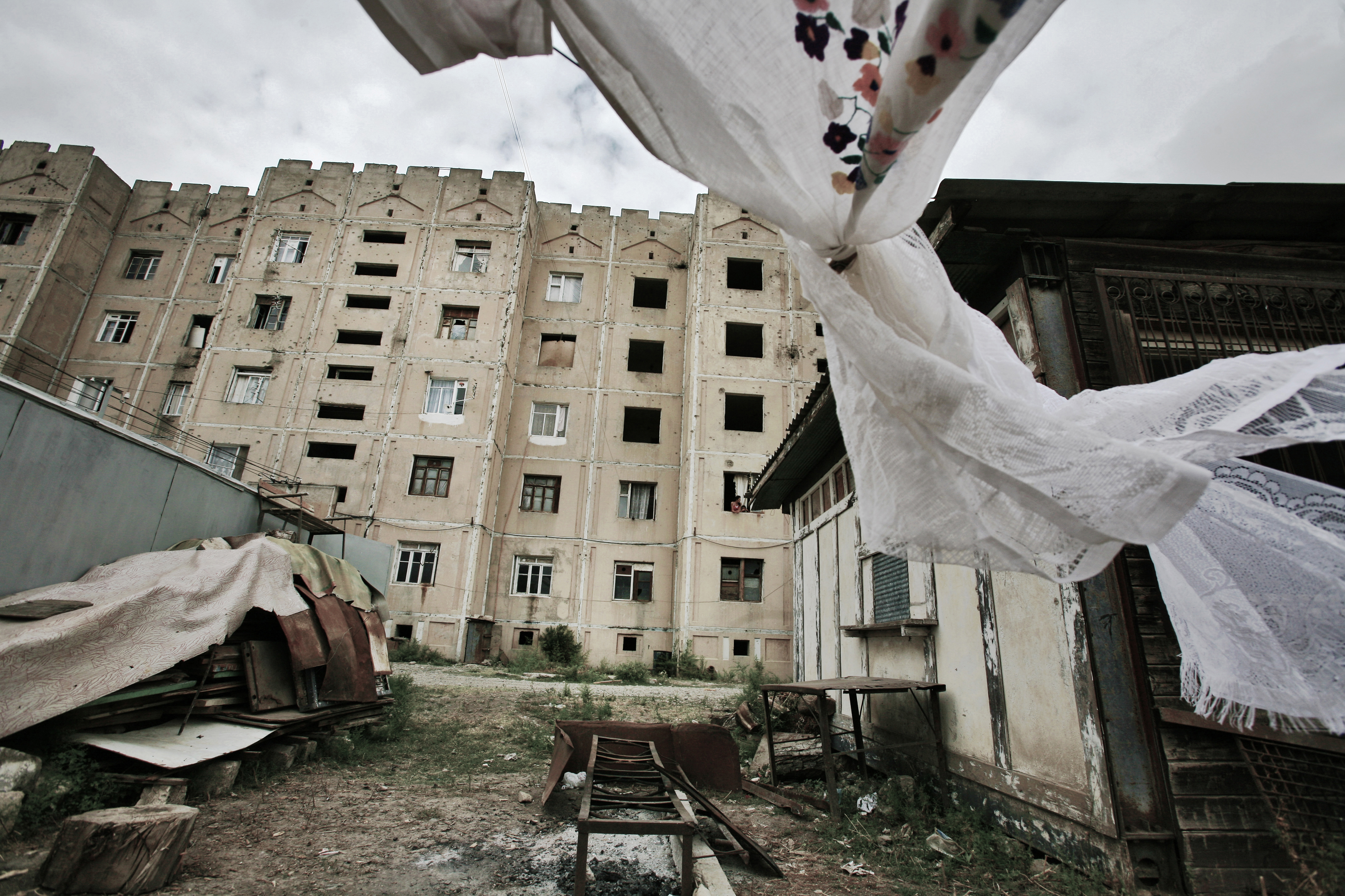 An apartment block is seen in Khojaly city, Nagorno-Karabakh. The city is a military base, situated near the border with Azerbaijan and 10 km Northeast of the capital Stepanakert. The city is known for the Khojaly Massacre committed on 25–26 February 1992 by the Armenian and, partially, by CIS armed forces (the Russian 366th Motor Rifle Regiment) during the Nagorno-Karabakh War. Khojaly, Nagorno-Karabakh, 19 September 2008.