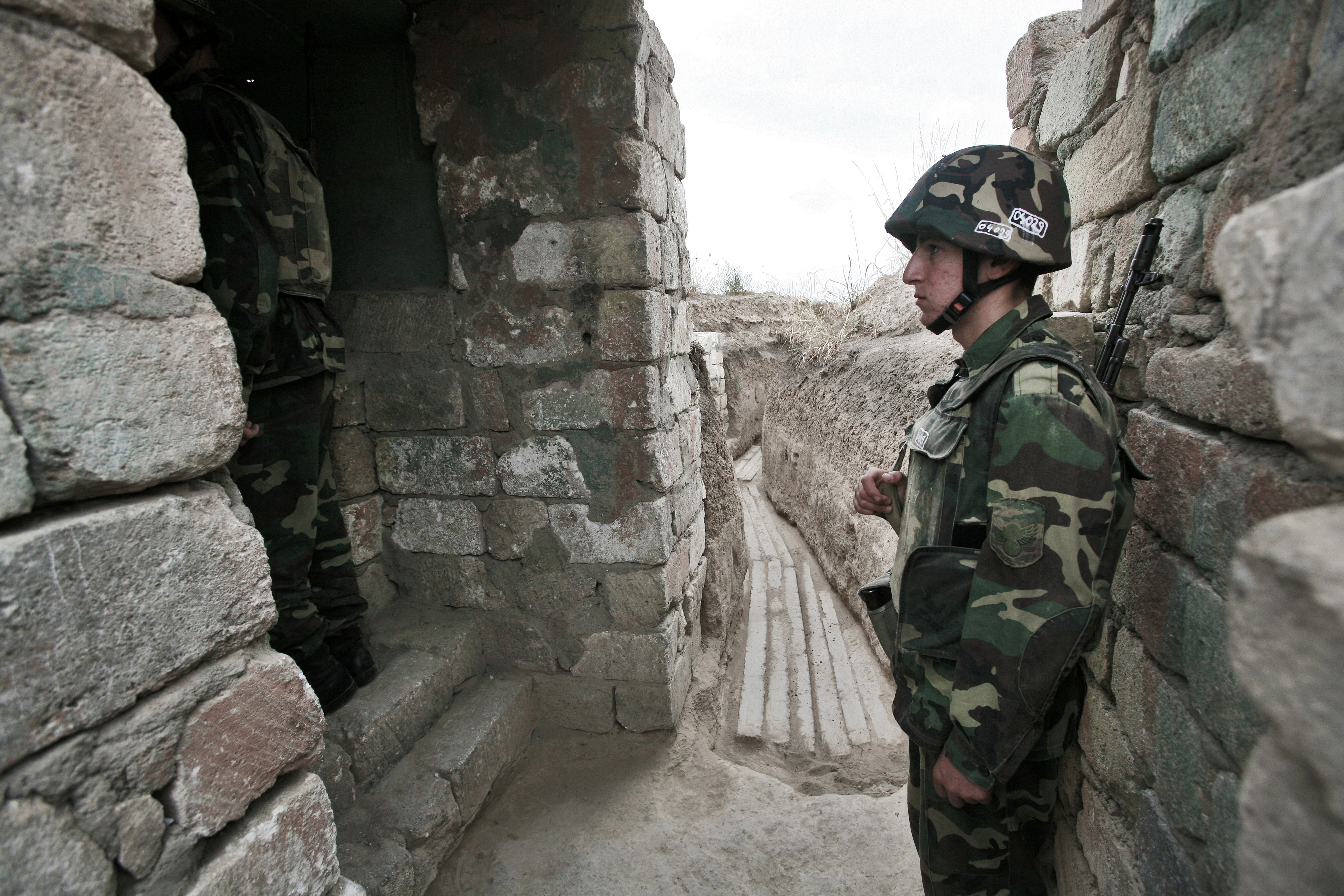 Nagorno-Karabakh   Two soldiers are on watch in their post at the security point - 300 m from the Azeri security point - in the Martakert military base situated on the Northeast borderline with Azerbaijan. The Nagorno-Karabakh Republic Defense Army is the formal defense force of the Nagorno-Karabakh Republic and was founded on May 9, 1992. The army is currently composed of around 20,000 officers and soldiers and its primary role is the protection of the NKR from foreign and domestic threats. Violations of the cease fire along the frontier are frequent and often result in the deaths of several soldiers and civilians each year. One of the most dangerous spots on the borderline with Azerbaijan is Martakert. In Nagorno-Karabakh and Armenia the military service is compulsory for two years for the citizens at age of 18-27. Many of the Armenian soldiers are deployed in military units close to the border with Azerbaijan. Armenia officially declared itself as a guarantee of security of Nagorno Karabakh, but it doesn’t officially recognize the independence of Nagorno Karabakh. This makes military service a sensitive issue for both Karabakh's ethnic and Armenian population. Martakert, Nagorno-Karabakh, 20 September 2008.