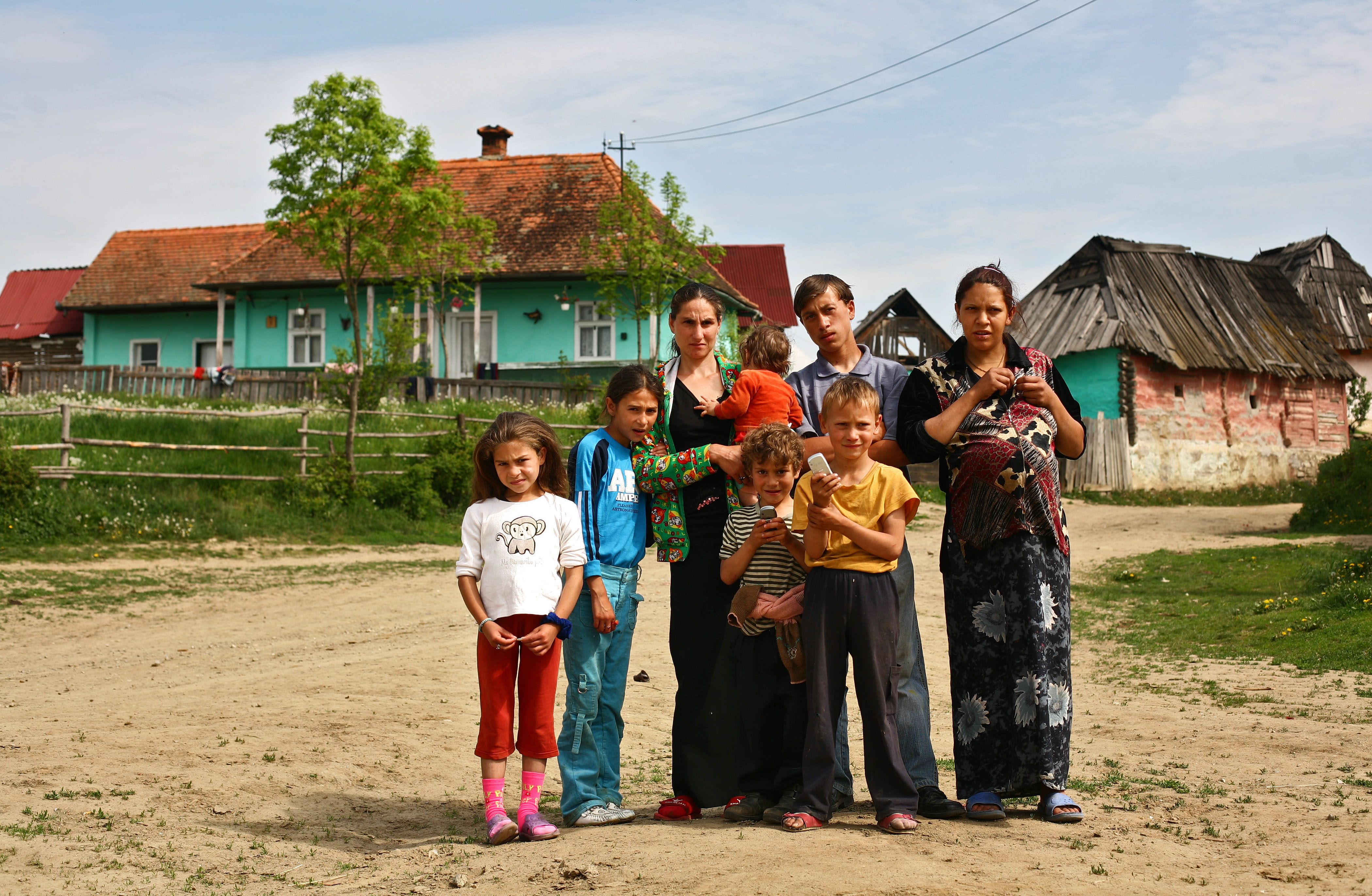 A gipsy family is posing on the road in Sanmartin village, Harghita county, Romania, 12.05.2010