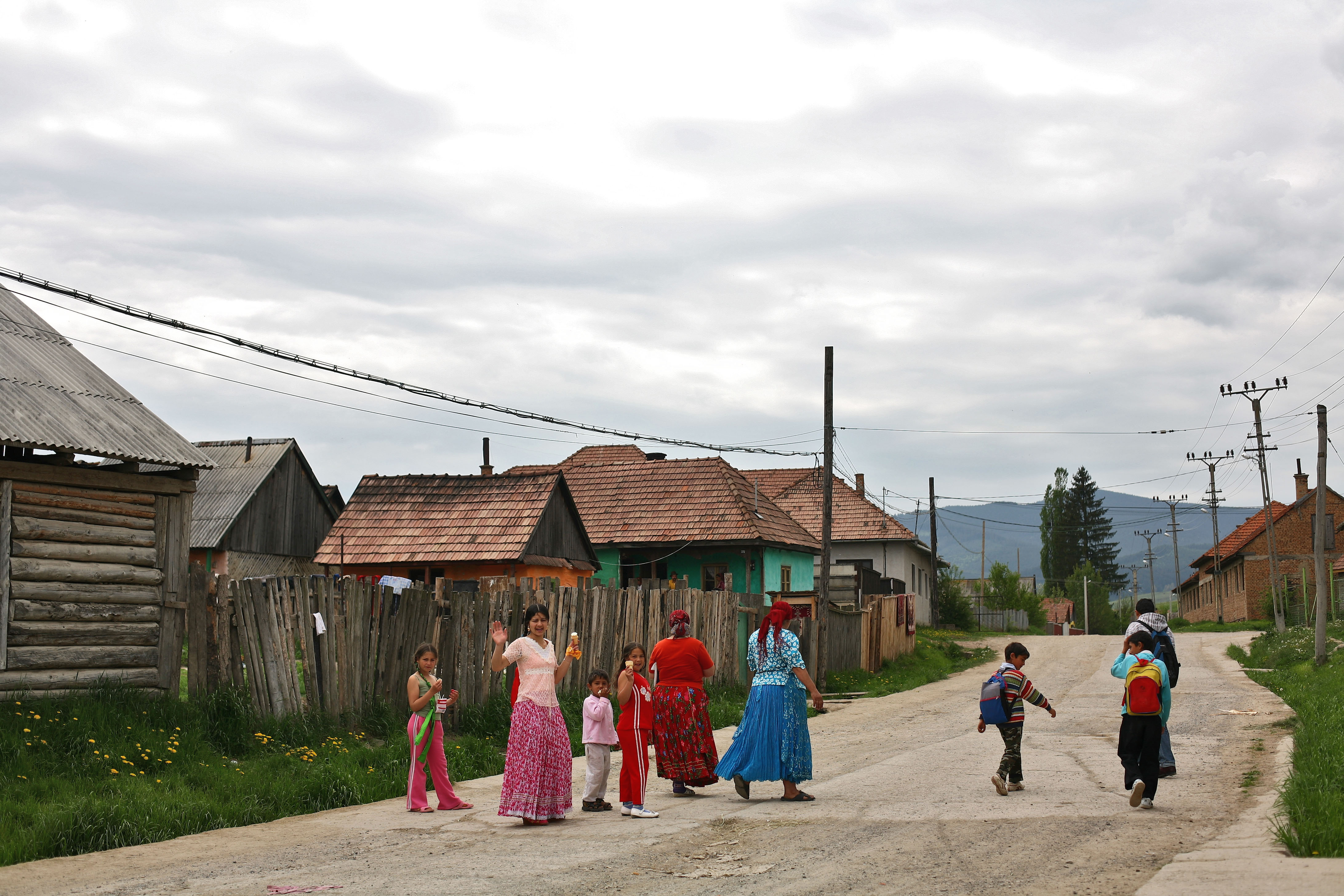Gipsy people are walking on the road in Sancraieni village, Harghita county, Romania, 13.05.2010.