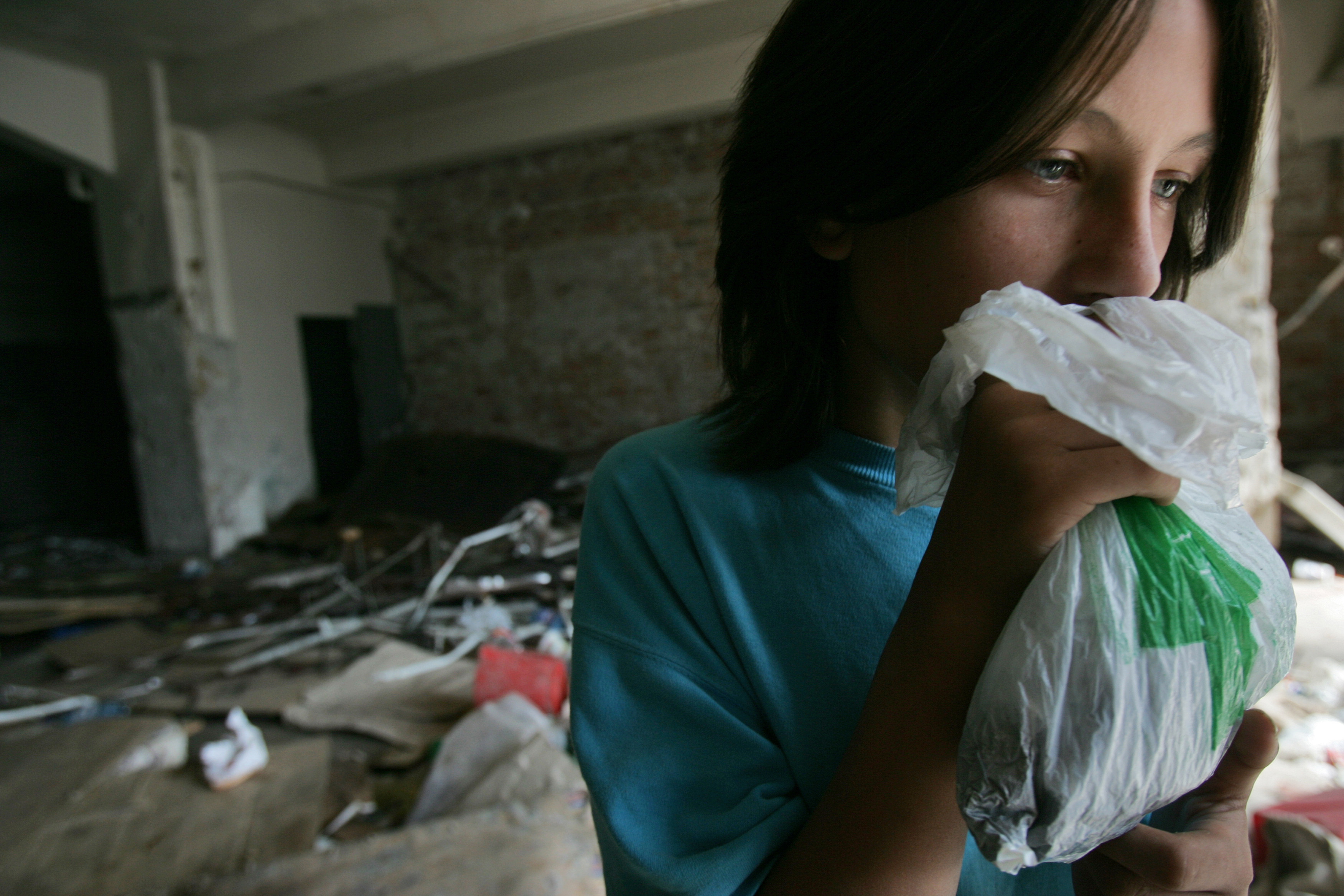 Ionela Pop inhales "aurolac" (a chemical used as glue) inside an abandoned building situated near "Gara de Nord" railway station. Ionela is a 13 years old homeless girl and prostitute. Bucharest, Romania 4.09.2005.