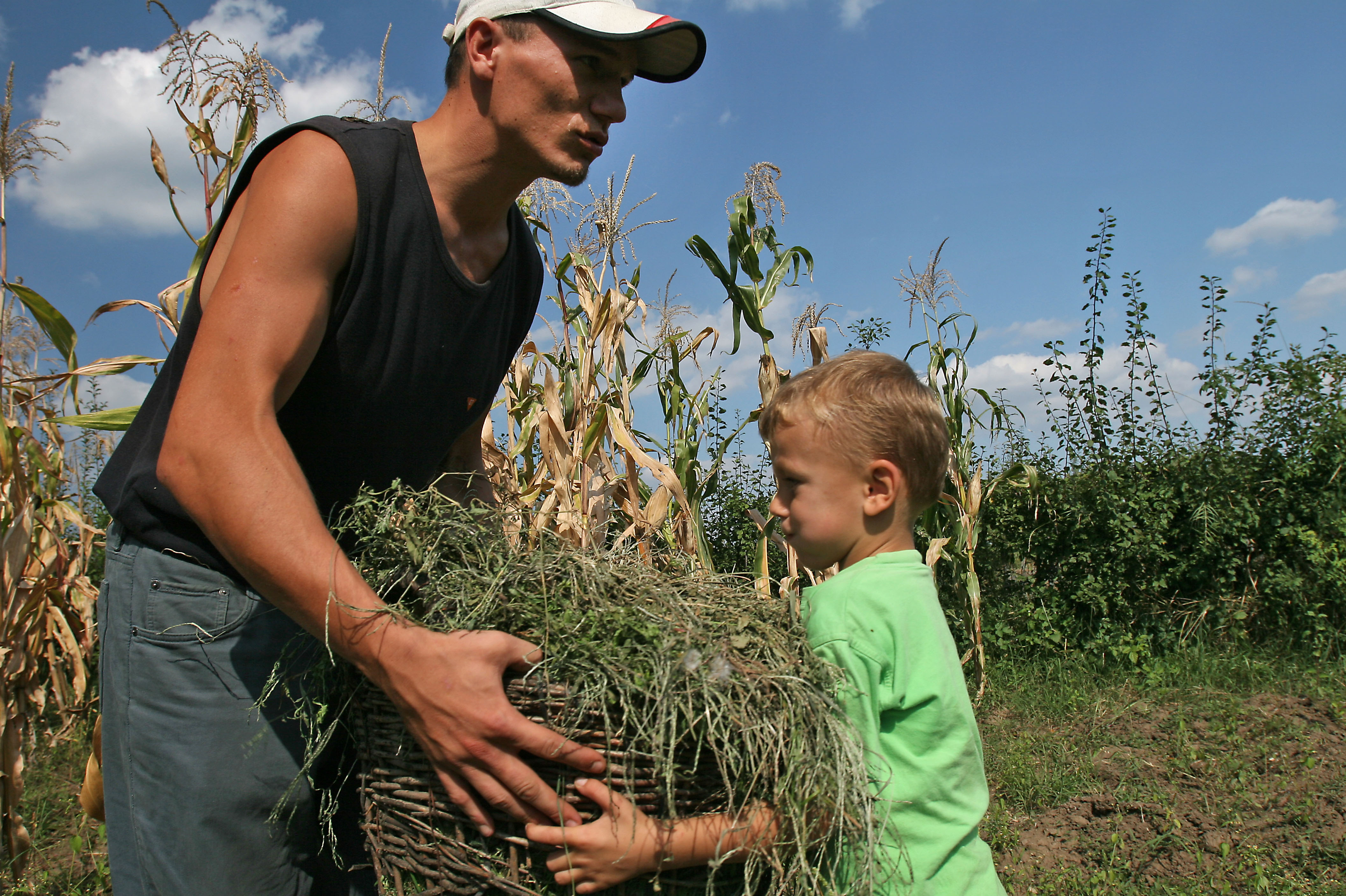 Gore Serbana works on the field with his older son Andrei, near to his house in Nedelea village, near Ploiesti city, Romania. Gore is a former street children who succeeded to improve his life conditions. PLoiesti, Romania, 10.09.2005.