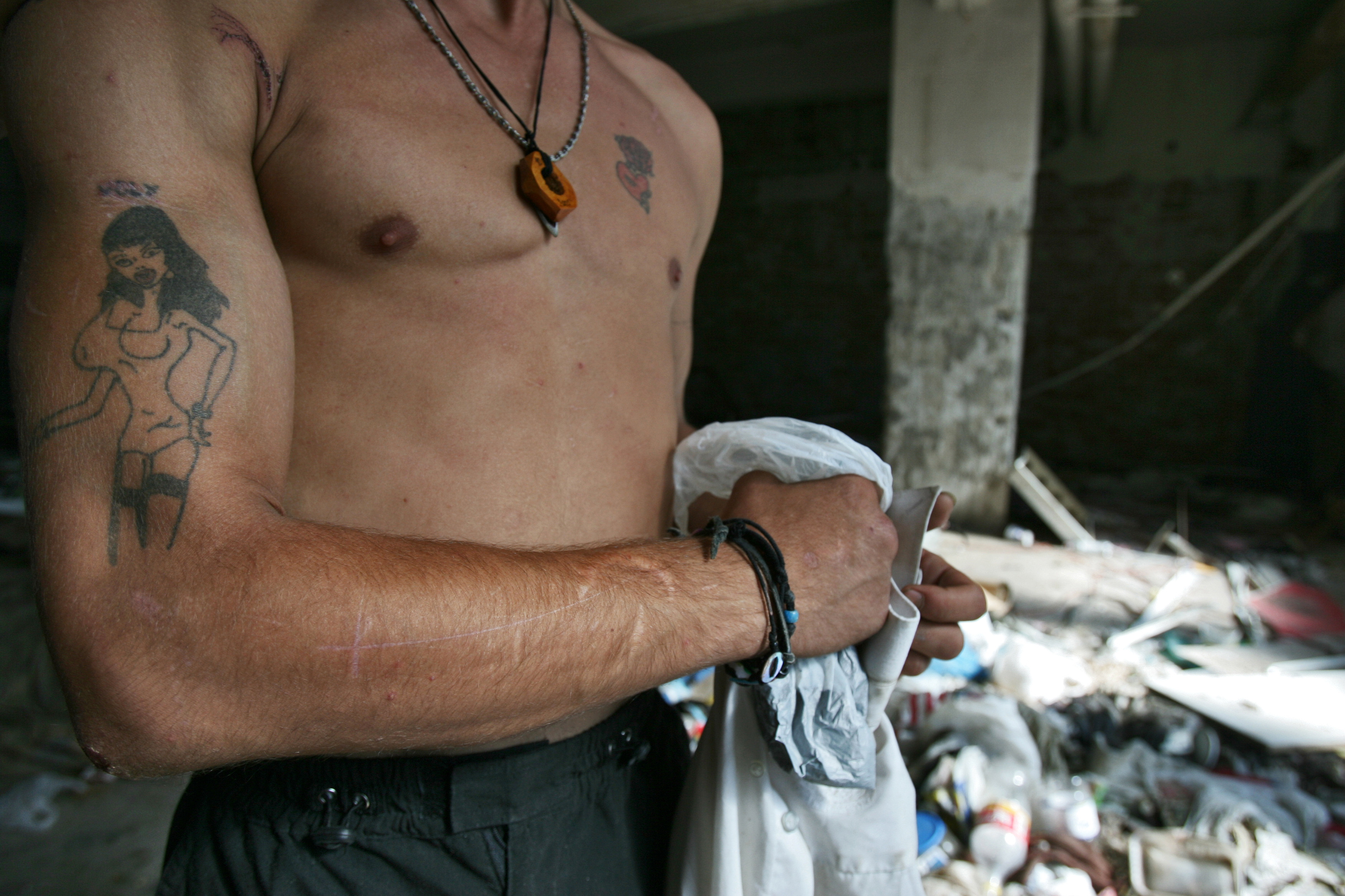 Gheorghe Anghel Stanciu, 21 years old homeless boy, shows his arm tattoo inside an abandoned building situated near "Gara de Nord" railway station. Bucharest, Romania 4.09.2005.