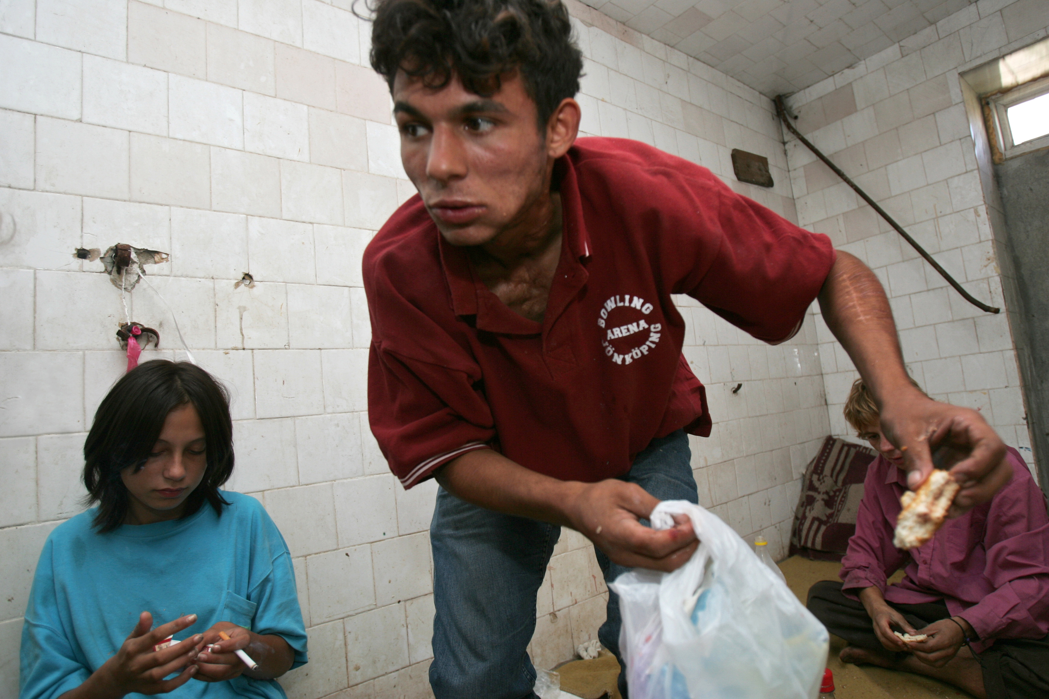 Street children   Gheorghe Anghel Stanciu, 21 years old homeless boy (C), Ionela Pop,13 years old homeless girl and prostitute (L), and Adrian Cugereanu, 21 years old homeless boy (R) stay inside an abandoned building situated near "Gara de Nord" railway station. Bucharest, Romania, 4.09.2005.