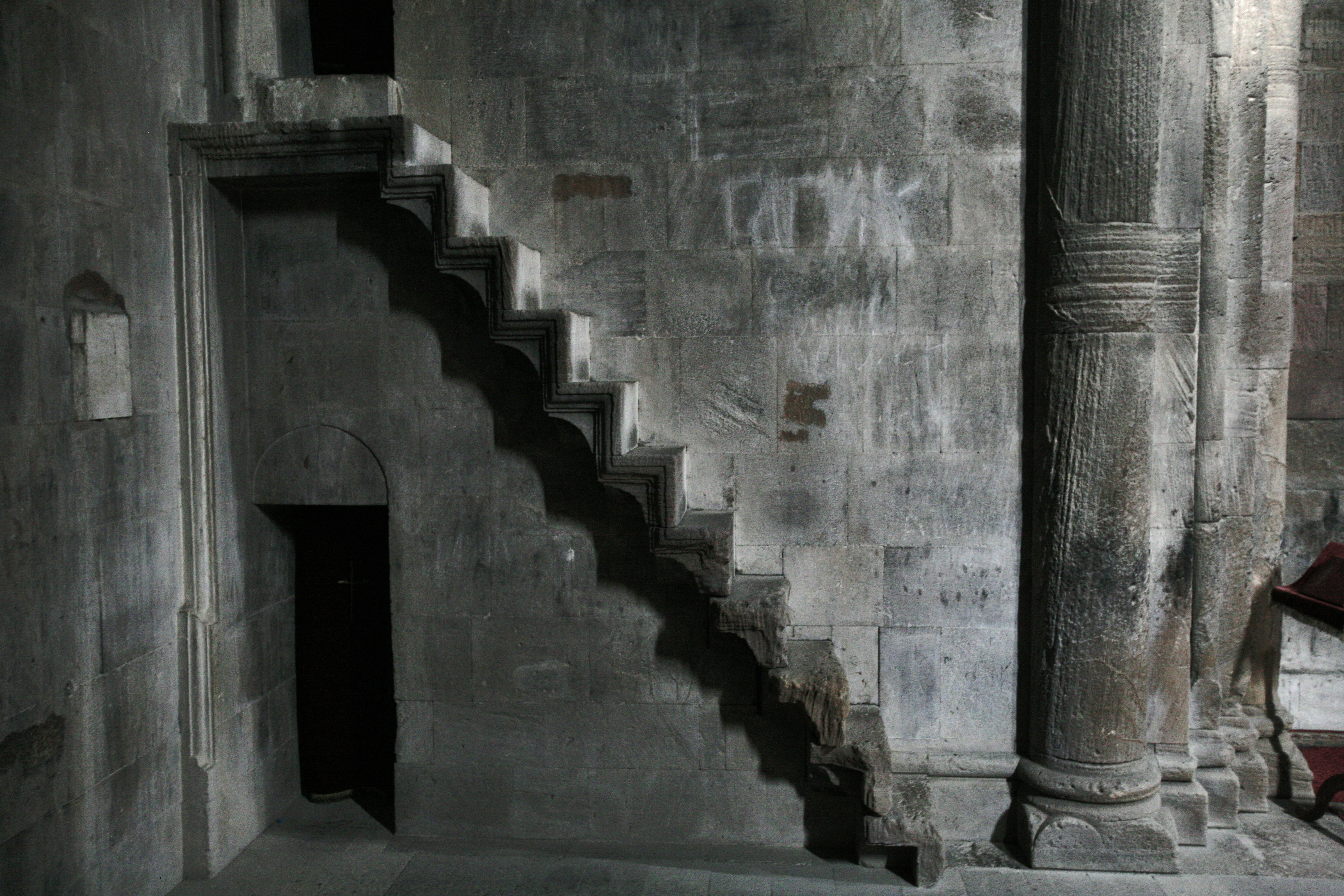 A staircase leads to a secondary altar in the Cathedral of St. Hovhannes Mkrtich, part of Gandzasar monastery, a X-XIIIth century Armenian monastery situated in the Martakert region, Nagorno-Karabakh. "Gandzasar" means treasure mountain or hilltop treasure in Armenian. The monastery holds relics believed to belong to St. John the Baptist and St Zechariah, father of John the Baptist. Most important structure of the Gandzasar monastery is the Cathedral of St. Hovhannes Mkrtich, built between 1216 and 1238. Gandzasar is considered one of five the most important examples of Armenian monumental art which belong to the world’s architectural masterpieces. Martakert, Nagorno-Karabakh, 20 September 2008.