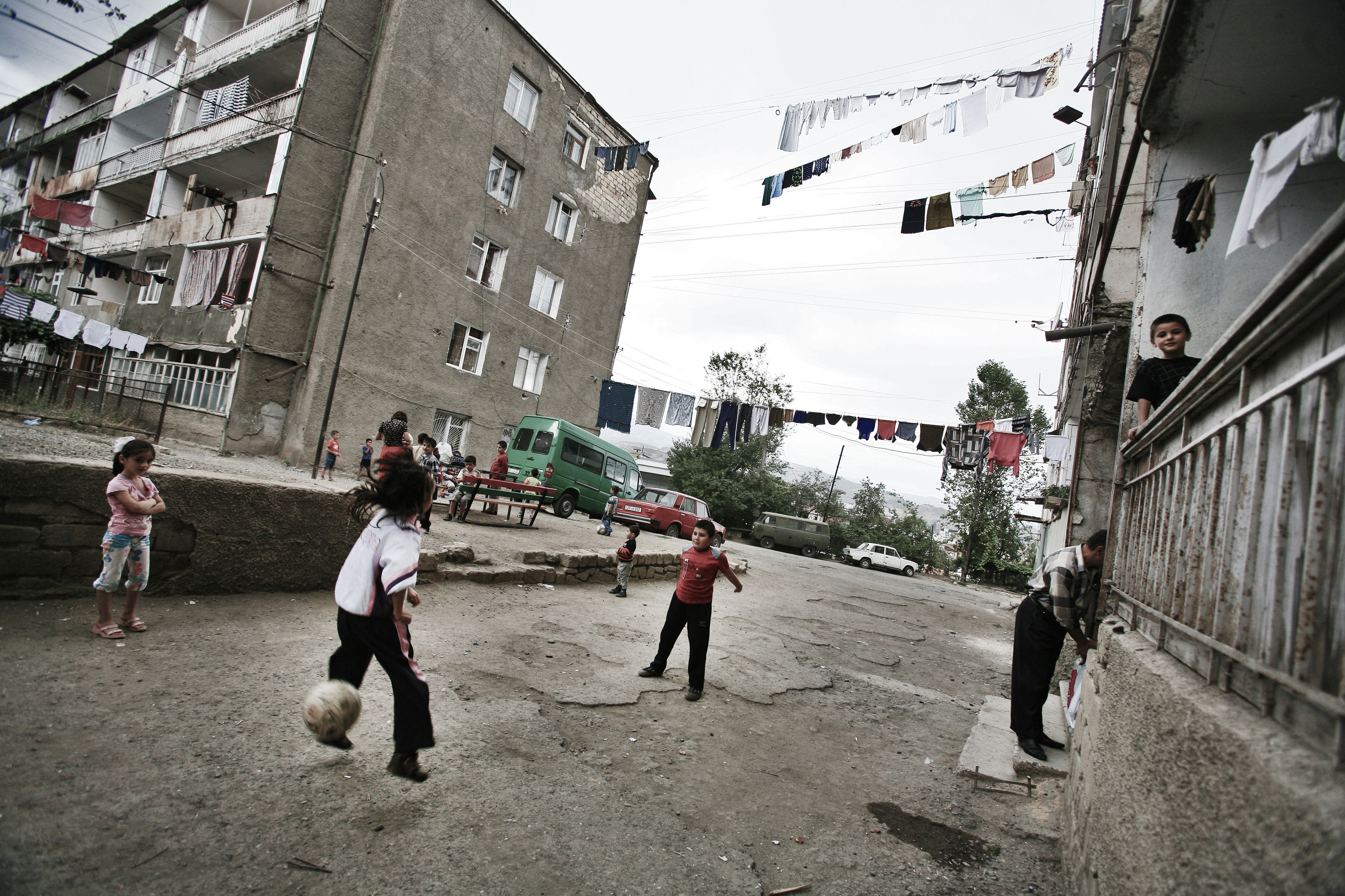 Nagorno-Karabakh   Children play with a ball in a residential district in the capital Stepanakert. With a population of 140.000, the majority being Armenians, Nagorno Karabakh Republic aims to achieve political and economical stability. The high unemployment rate, low salaries and the lack of opportunities for the youngsters make the unrecognized republic to be a hard place to live. Stepanakert, Nagorno-Karabakh, 20 September 2008.