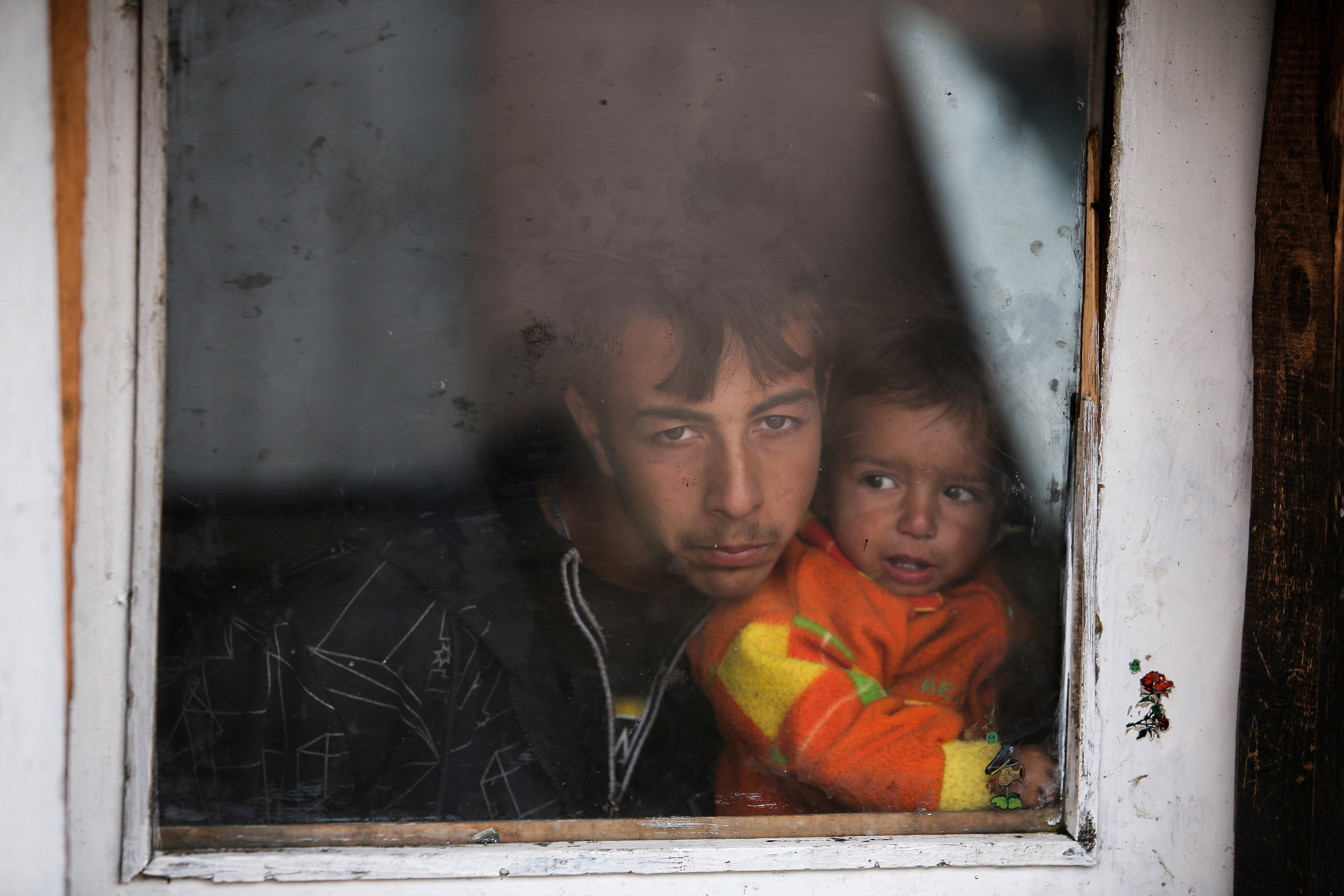 Gipsy boy   A boy is posing with his little brother from behind a window, in an improvised gipsy settlement on the outskirts of Miercurea Ciuc city, Romania, 3.10.2013. Several Roma families have been living improvised shelters, after the local authorities evicted them from houses they had abusively occupied downtown Miercurea Ciuc.