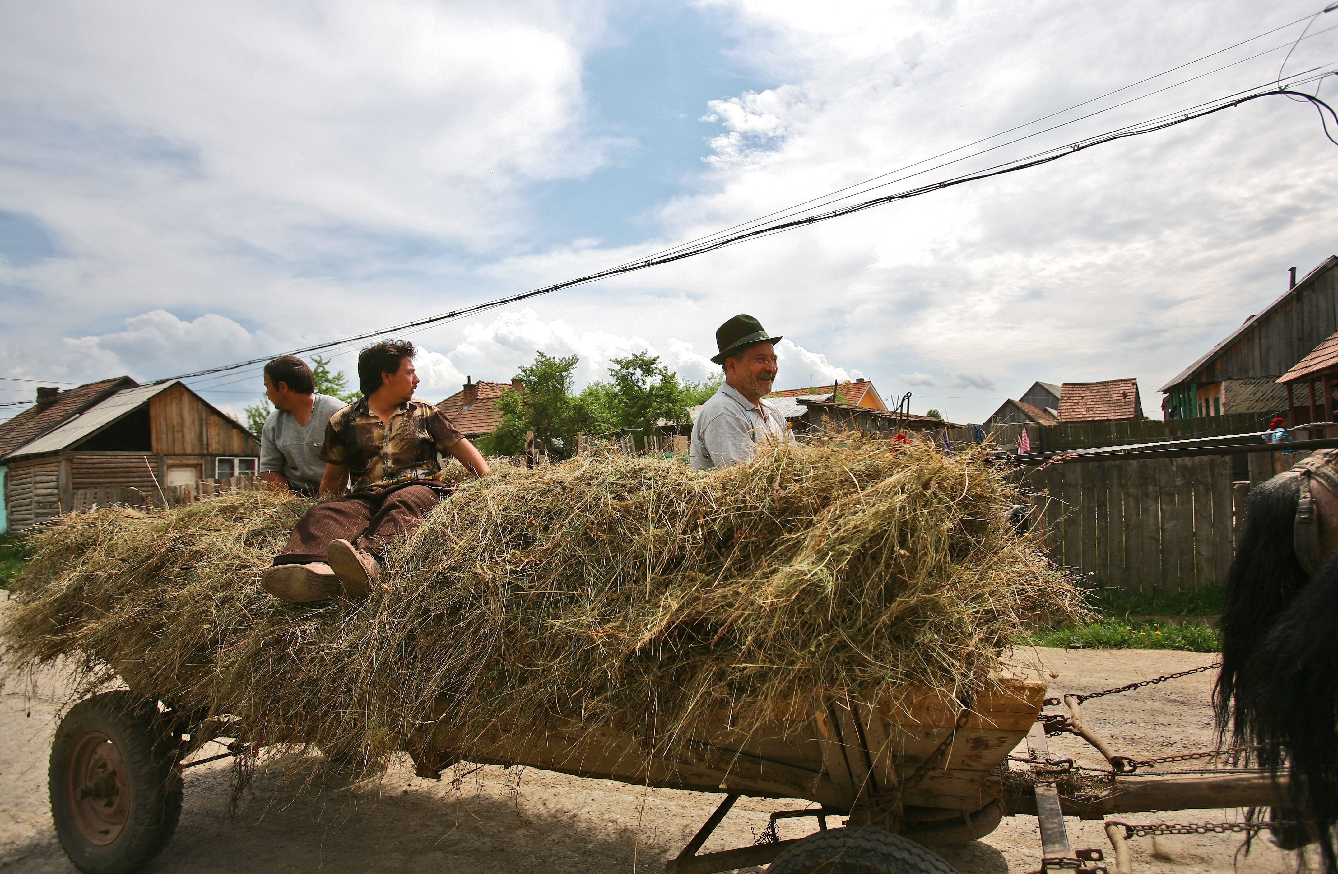 Gipsy family   Gipsy people are driving a cart full of hay in Sancraieni village, Harghita county, Romania, 13.05.2010.