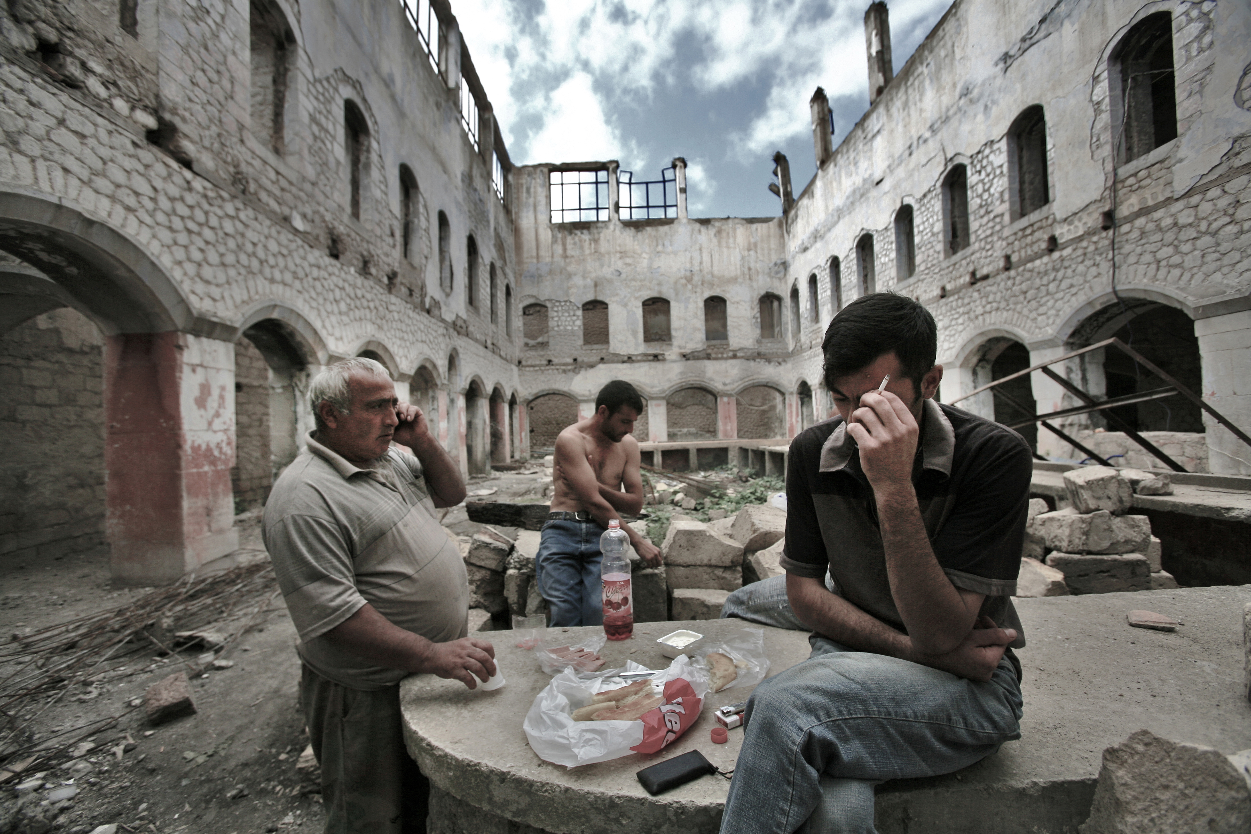 A group of workers rests during the lunch break inside a ruined building in the city of Shushi. Before the Nagorno-Karabakh War the city was the main cultural center of Karabakh, also known as “Paris of the Caucasus”. With more than three quarters of the buildings being destroyed during the war, the city has begun the reconstruction of historical buildings with a special architectural and historical value. Shushi, Nagorno-Karabakh, 18 September 2008.